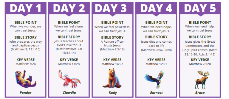 Kids will learn that no matter what happens in life they can trust Jesus! The nightly concepts are meant to introduce kids to concepts of confidence and resilience through the Bible. A more in-depth look at each night’s teaching is available below.